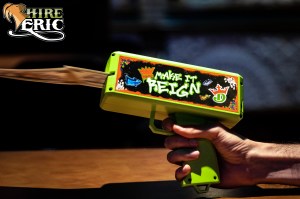 With that in mind, I decided to take the Reign Maker from a mere prototype to a full-functioning, cash-spewing product. After a heavy spray-paint job, a bulk order of stickers, one giant order of fake hundo-dolla bills — we got this bad boy: